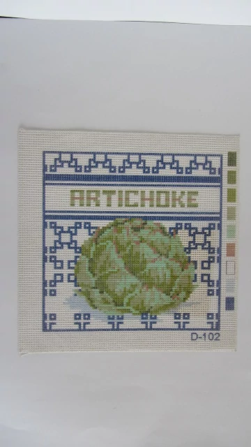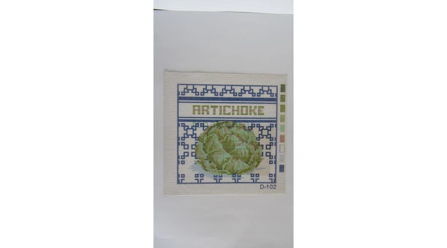 A mintával előnyomott gobelin lap egy articsóka növényt ábrázol, a széleken a javasolt felhasználandó fonalak színkódjával.