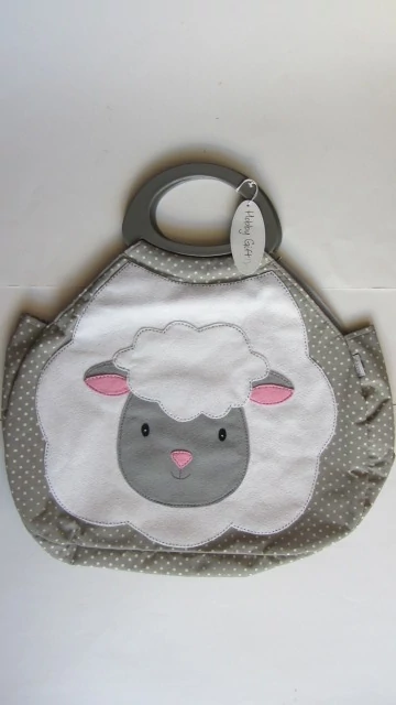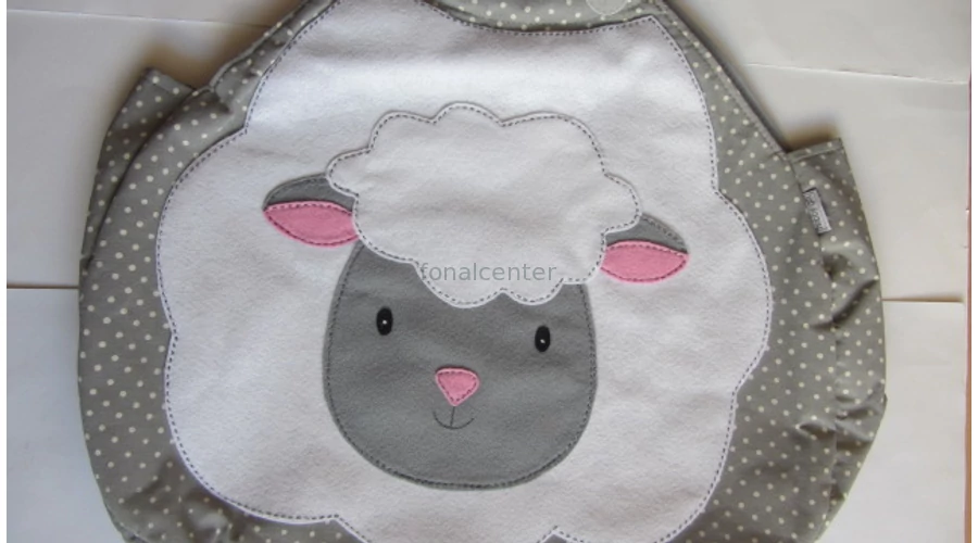 A táskán kívülről rátett bárány képet láthatunk, aminek anyagát még szürke pöttxyök díszítik.